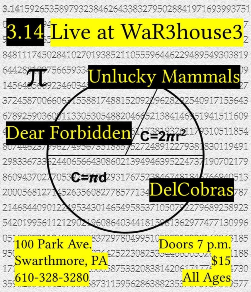 Our next show, by the way, will be with Unlucky Mammals and Dear Forbidden at Warehouse3 in Swarthmore on March 14. It’s an excellent space, but it might be a little hard to find, as it’s at the end of an alley with no outlet. Your GPS may take you to a US Post Office, but that’s not the place. Our advice is to get directions to Renato Pizza on Park Avenue and then set out on foot.